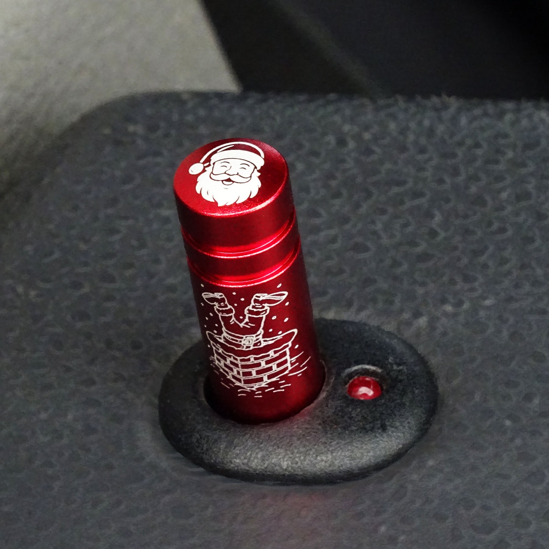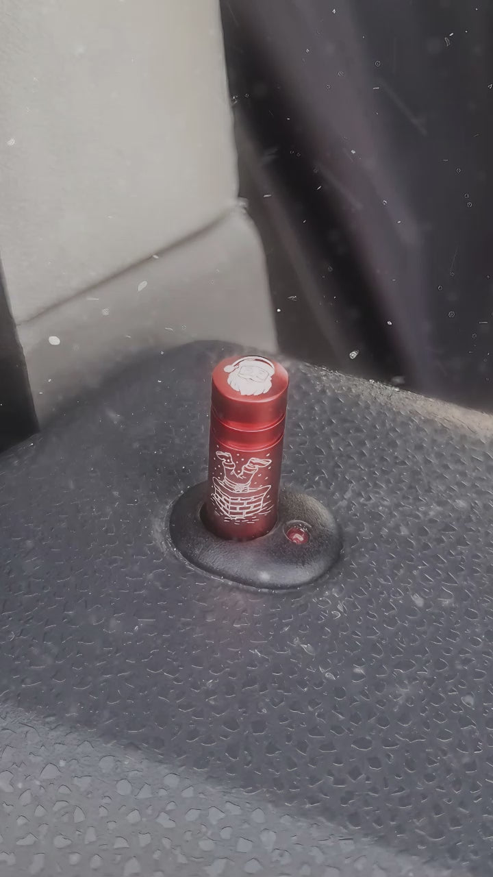 Give your Transporter a festive upgrade. This CNC-machined aluminium door lock pin features a crisp laser-etched Santa design that “drops down the chimney” each time you lock the door and the pin disappears into the door card.